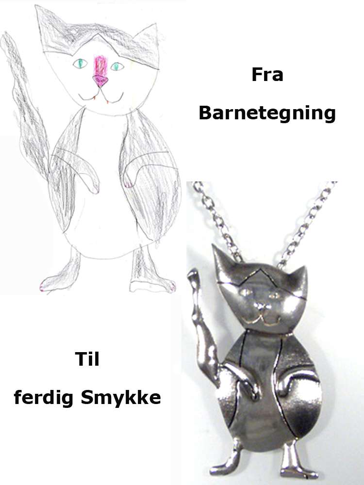 Ditt barns eller barnebarns tegninger kan lages til morsomme anheng. Kjempefine gaver og morsomme minner. Både til liten og stor. Vi redigerer tegninga slik at det blir et smykke som ivaretar originalutrykket fra ditt barn. Om du vil graverer vi også navn og dato på baksida. Som oftest lages tegningene som litt store anheng med langt kjede i str 35 - 40 millimeter av argentium sølv (beste kvalitet 925 anløpsbeskyttet sølv). Anhenget lages avrundet 3d, ikke som en utskjært platebit med gravert tegning - resultatet koster noe mer, men blir vesentlig bedre. Det koster ingenting å sende en tegning med forespørsel.
